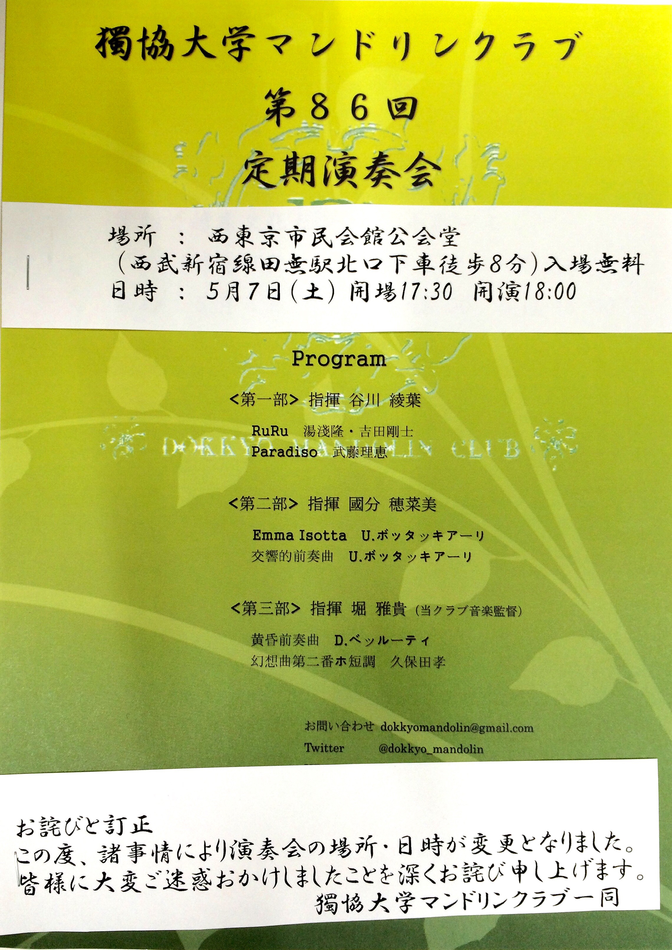 今回、第86回定期演奏会の日時・会場を変更することとなりましたので、ご報告させていただきます。