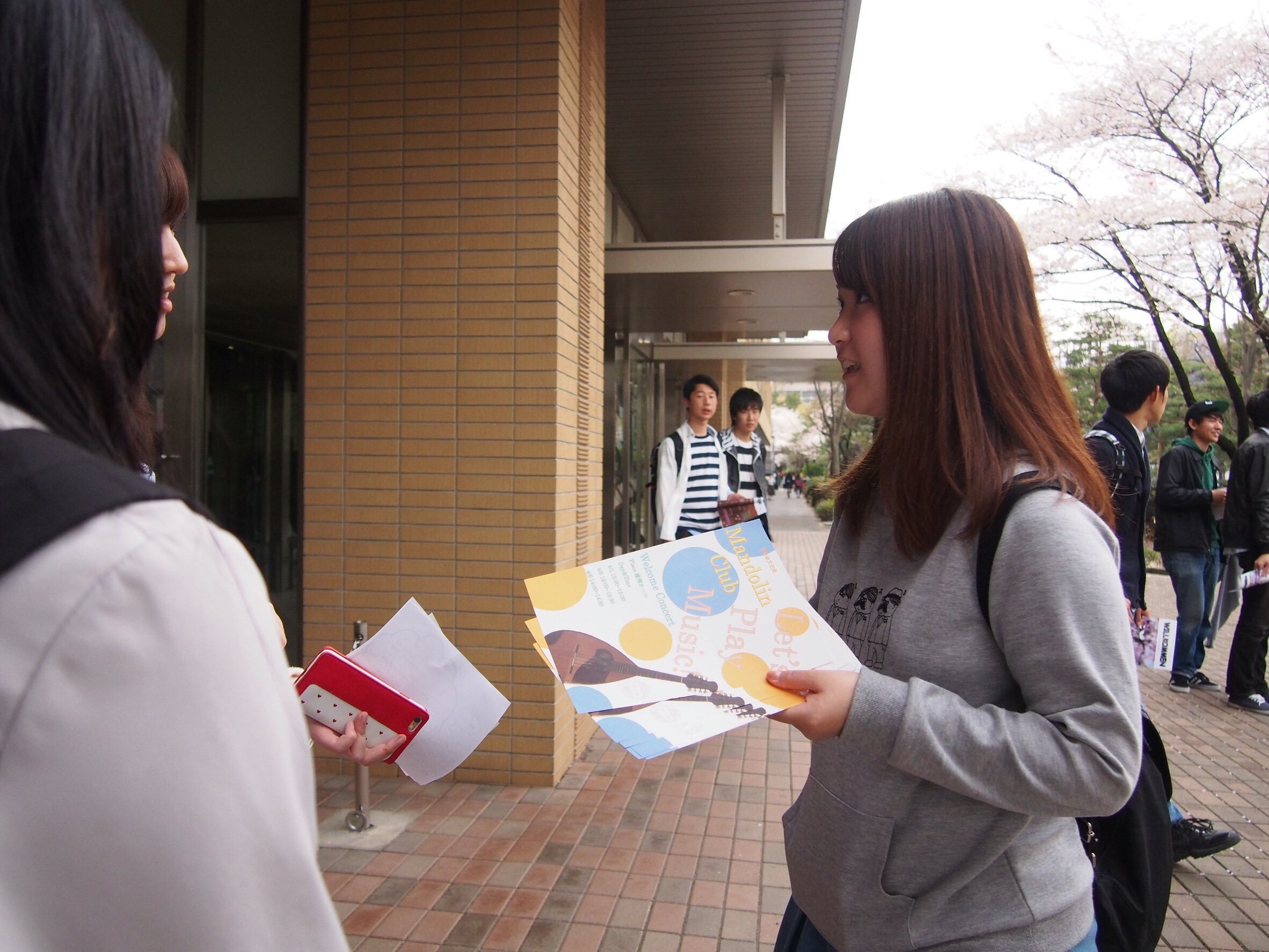 1人でも多くの1年生にマンドリンクラブについて知ってもらえるように、何に入るか考え中の方々の選択の1つとなってもらえるように、配らせて頂いております。