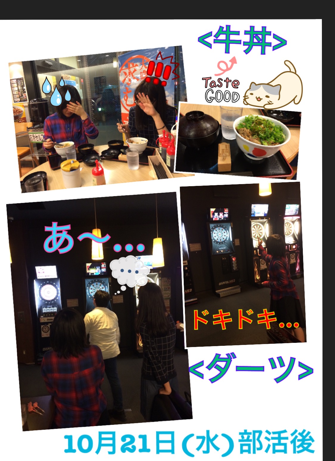 お疲れ様でした‼︎部活とは関係のない出来事ですが、今日の部活後に部長とマンドリン3年、マンドラ1年、ベース1年の4人で夜ご飯を食べに&ダーツをしに行きました。人生初めてのダーツで最初は難しかったのですが、慣れるととても楽しくなってきました‼︎また先輩方や同期のみんなで遊びに行きたいです‼︎(笑)