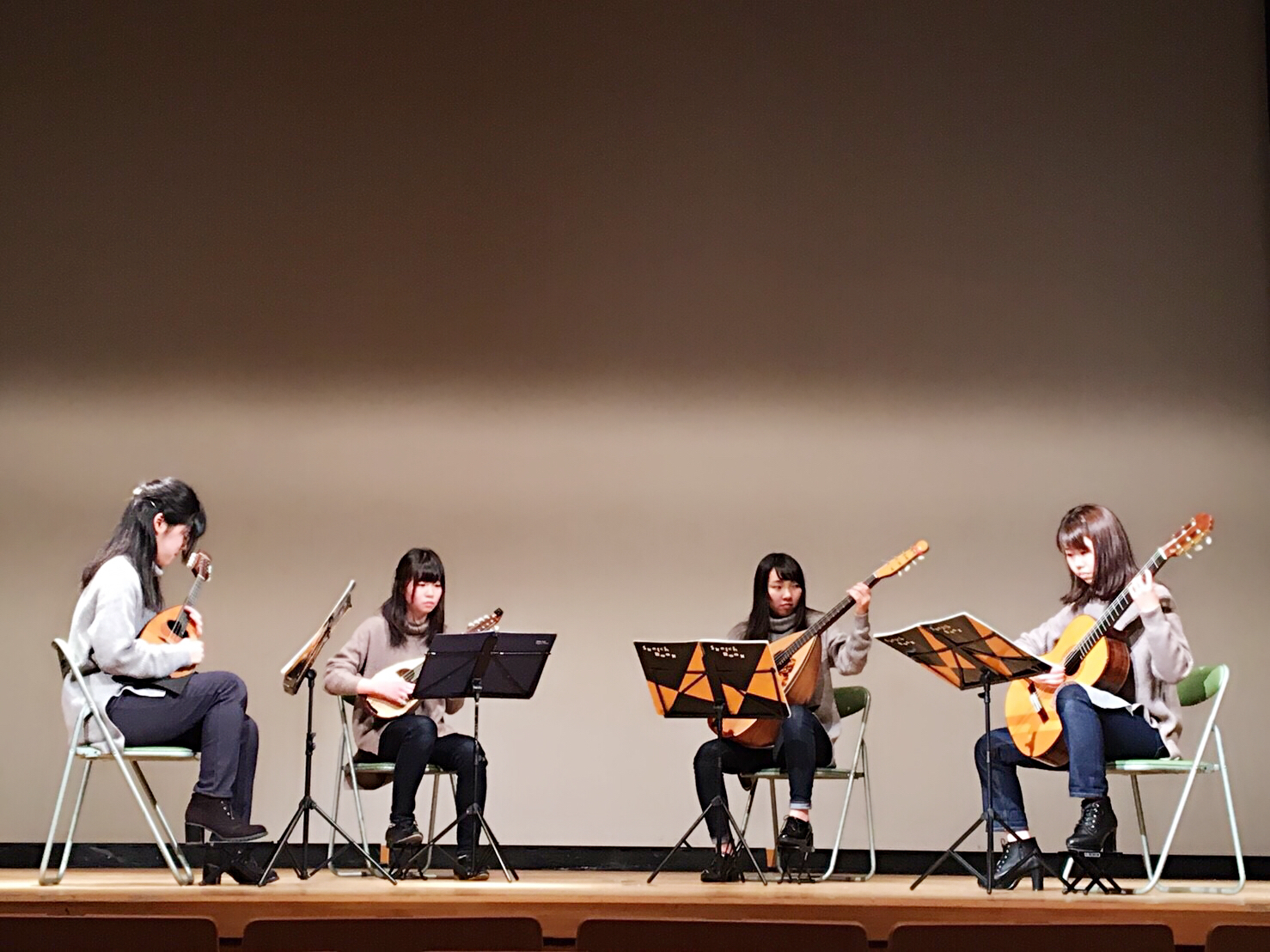 今年の1年生は例年よりも早く準備を始めてくれたようです。演奏がすごく上手になっていて、上級生はそれだけで感動なのですが、今回はサプライズがありました。まず、4人でおそろいの衣装を着てる!しかもオシャレ。そしてお互いのパートを交換してアンサンブル!マンドリンとマンドロンチェロを交換して弾いていて、すごいなぁと思っていたら、その次はマンドリンとギターを交換して弾いていてびっくり!!そして演奏後は4年生の今までのマンドリンクラブでの写真をまとめた動画…の後に、あの「恋ダンス」を1年生が踊っている動画まで…さらにさらに、4人それぞれの高校時代の制服を着てのアンコール。