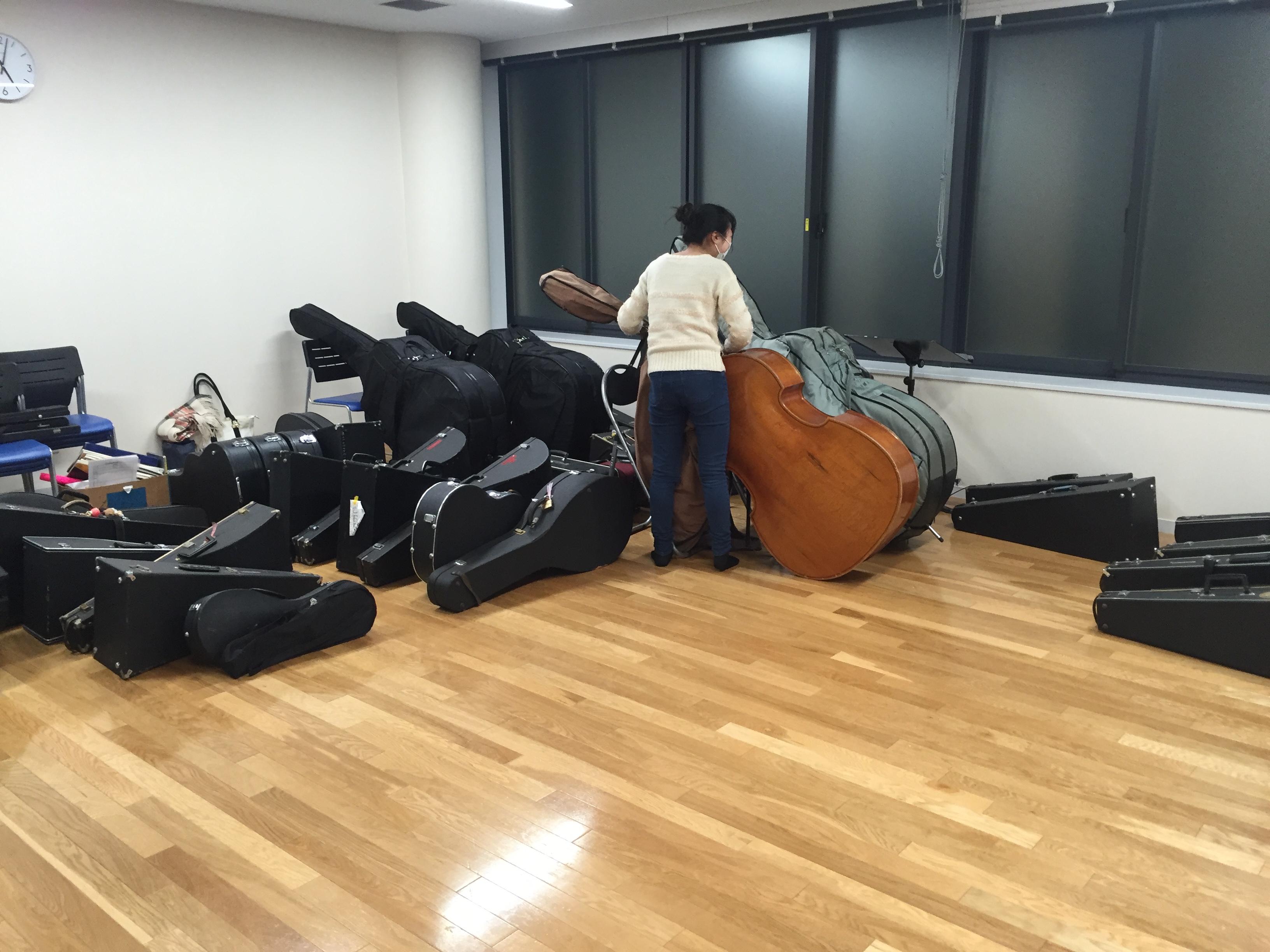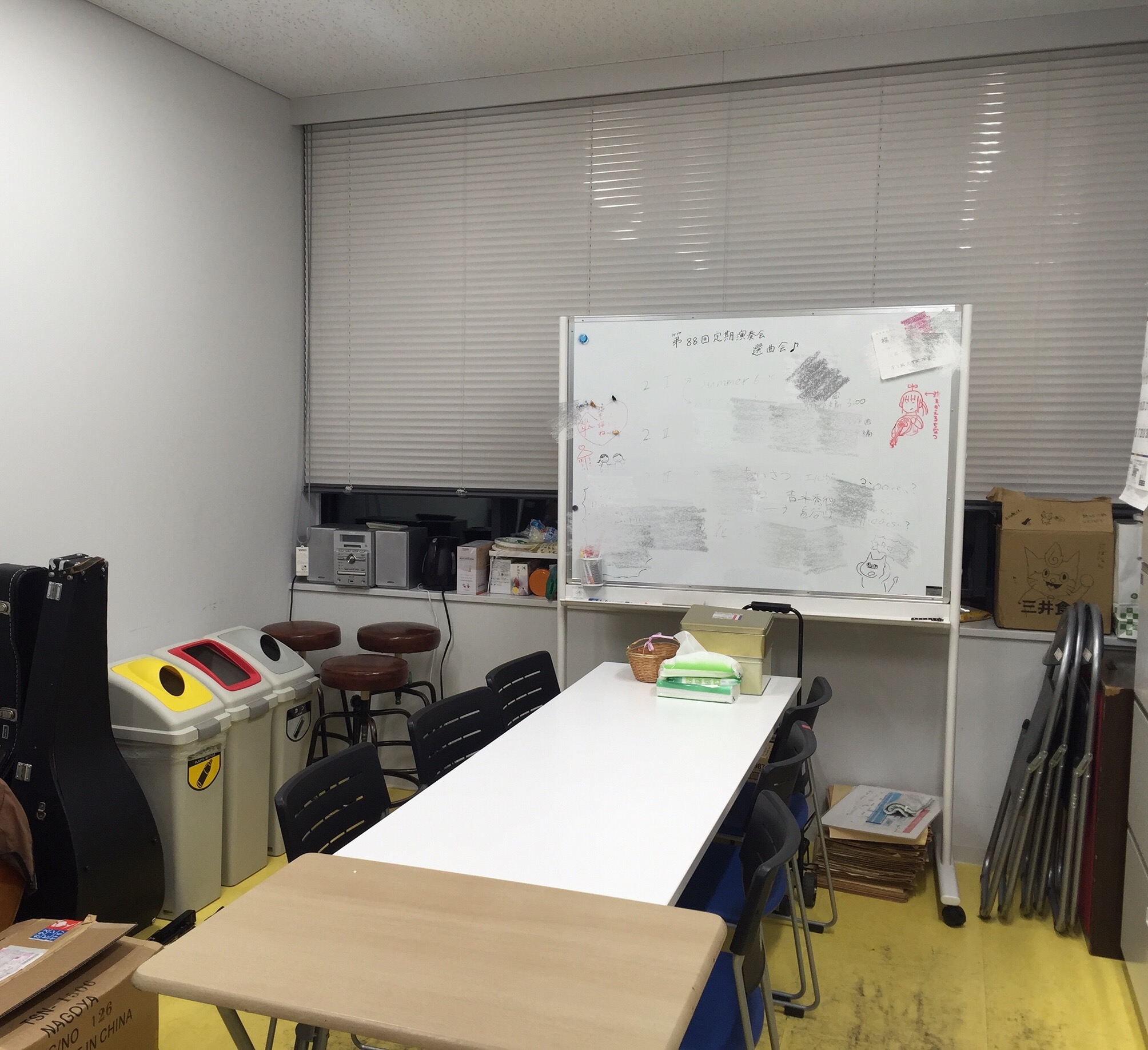狭さを解消するために、思い切って棚、机、コントラバスの配置を変えてみました。机まわりのスペースが広くなって、かなり座りやすくなったのではないかと思います。これで部室でパート練習する時もっとスムーズになるはず♪